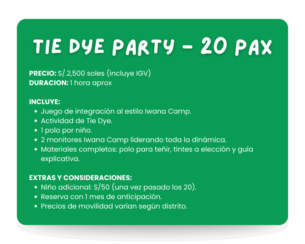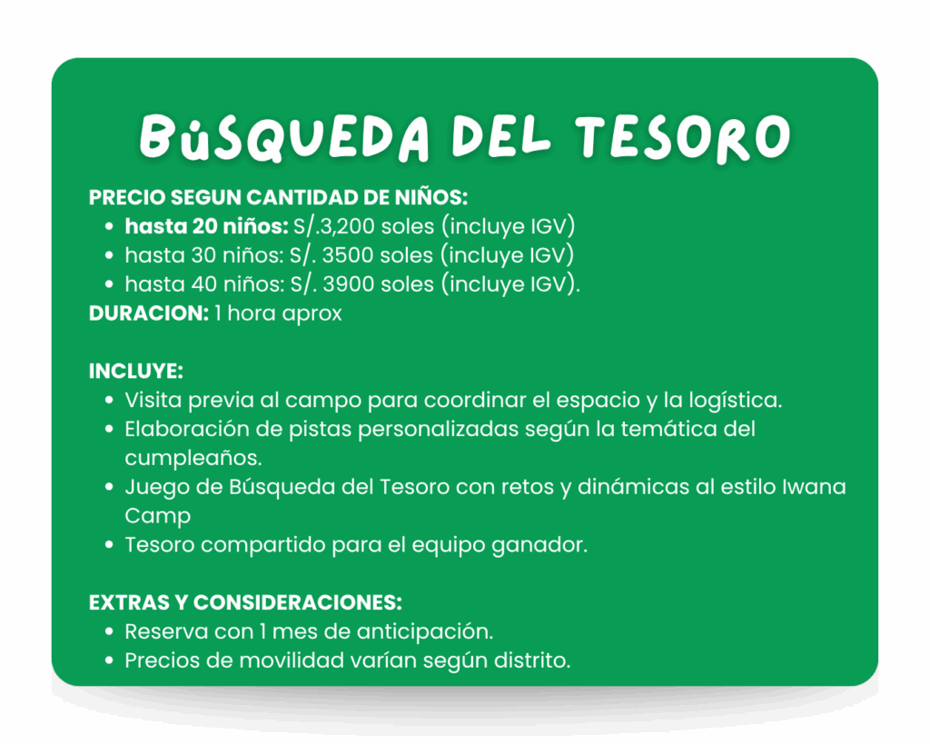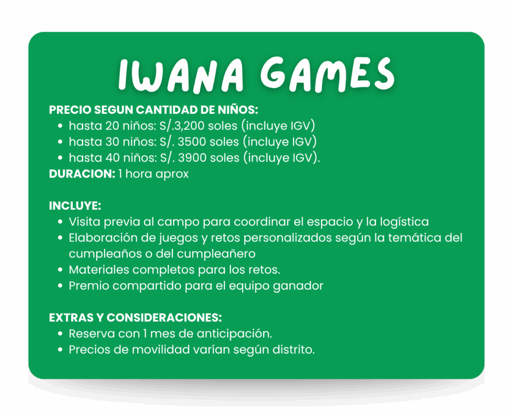 Celebra tu cumpleaños rodeado de juegos y actividades únicas para ti y tus amigos. Celebra tu cumpleaños rodeado de juegos y actividades únicas para ti y tus amigos. RESERVA TU CUMPLEAÑOS AQUÍ ¿Qué OFRECEMOS? En Iwana Camp convertimos los cumpleaños en experiencias diferentes, llenas de diversión y conexión. Tú eliges la actividad que más te guste o combínalas en un pack especial. armamos un paquete a tu medida ¡Reserva tu fecha y haz de tu cumpleaños una experiencia diferente en Iwana Camp! RESERVA AQUÍ
